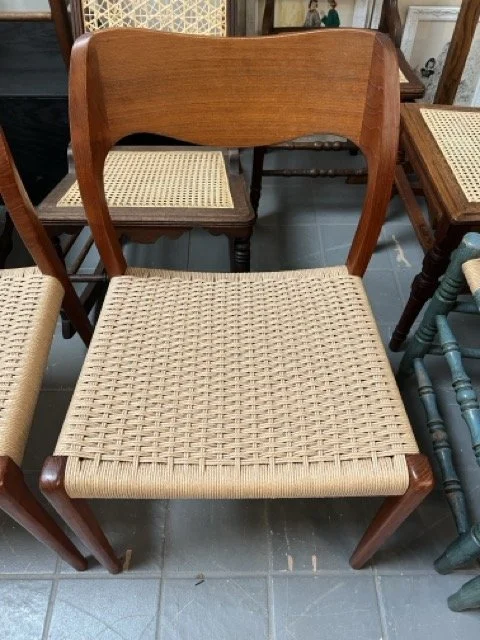 A sleek mid-century teak chair featuring a clean, geometric Danish cord weave pattern.