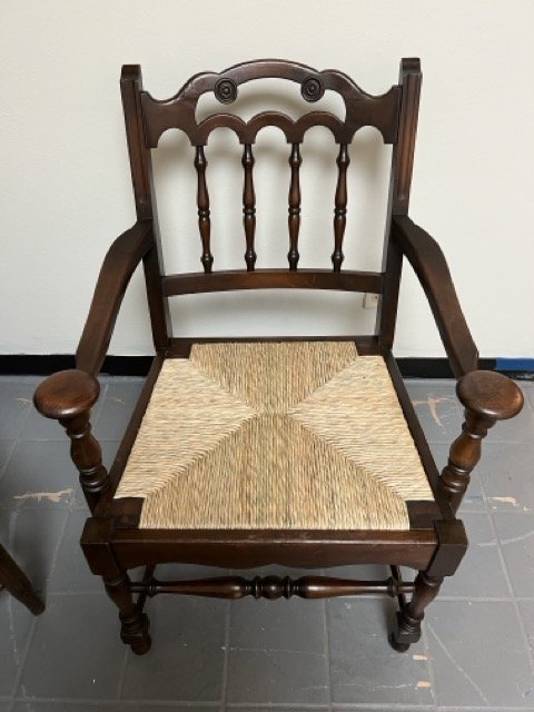 A beautiful dark wood armchair with an ornate spindle back and a natural rush woven seat.